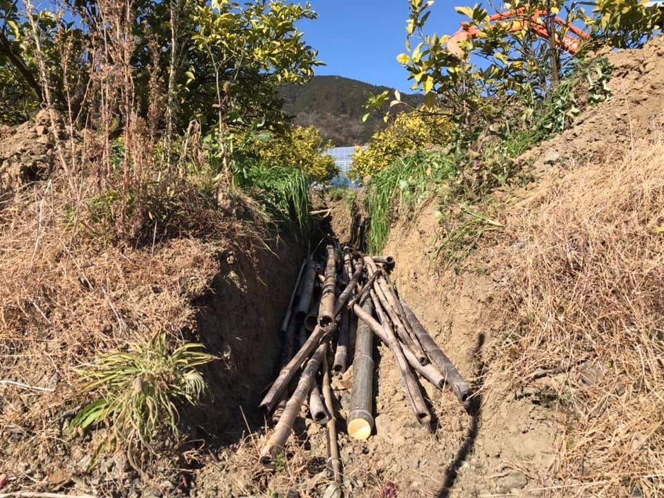 通り道を作り、そこに竹を入れ、土を戻す作業をするだけなのですが、ユンボを使ってもかなり時間がかかります。